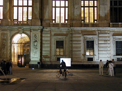 the videos at night in different venues, here a projection in
