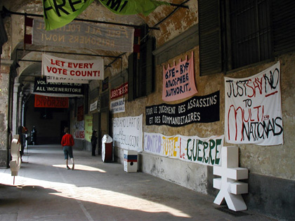 a protest in front of BIG Torino 2002 Exhibition area.